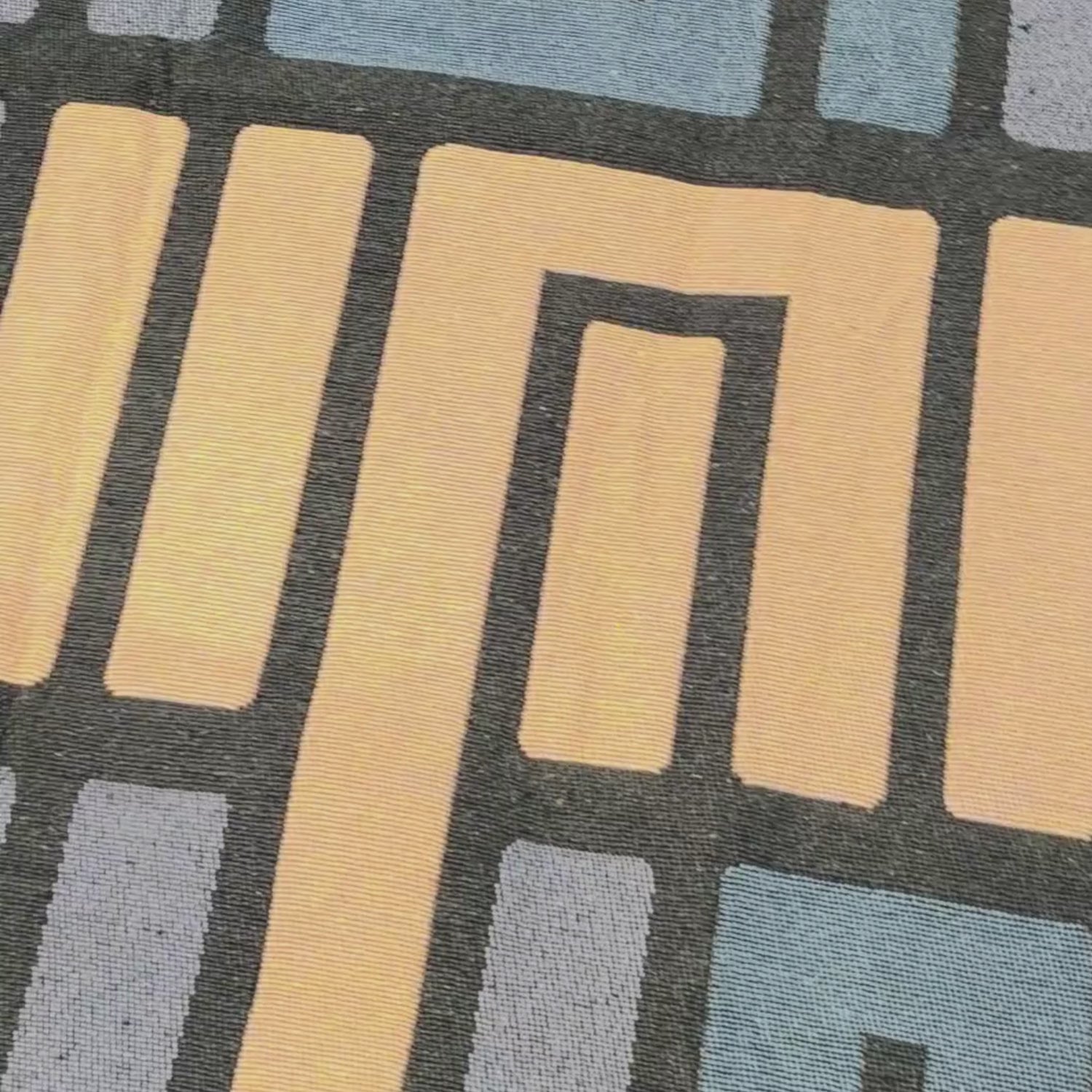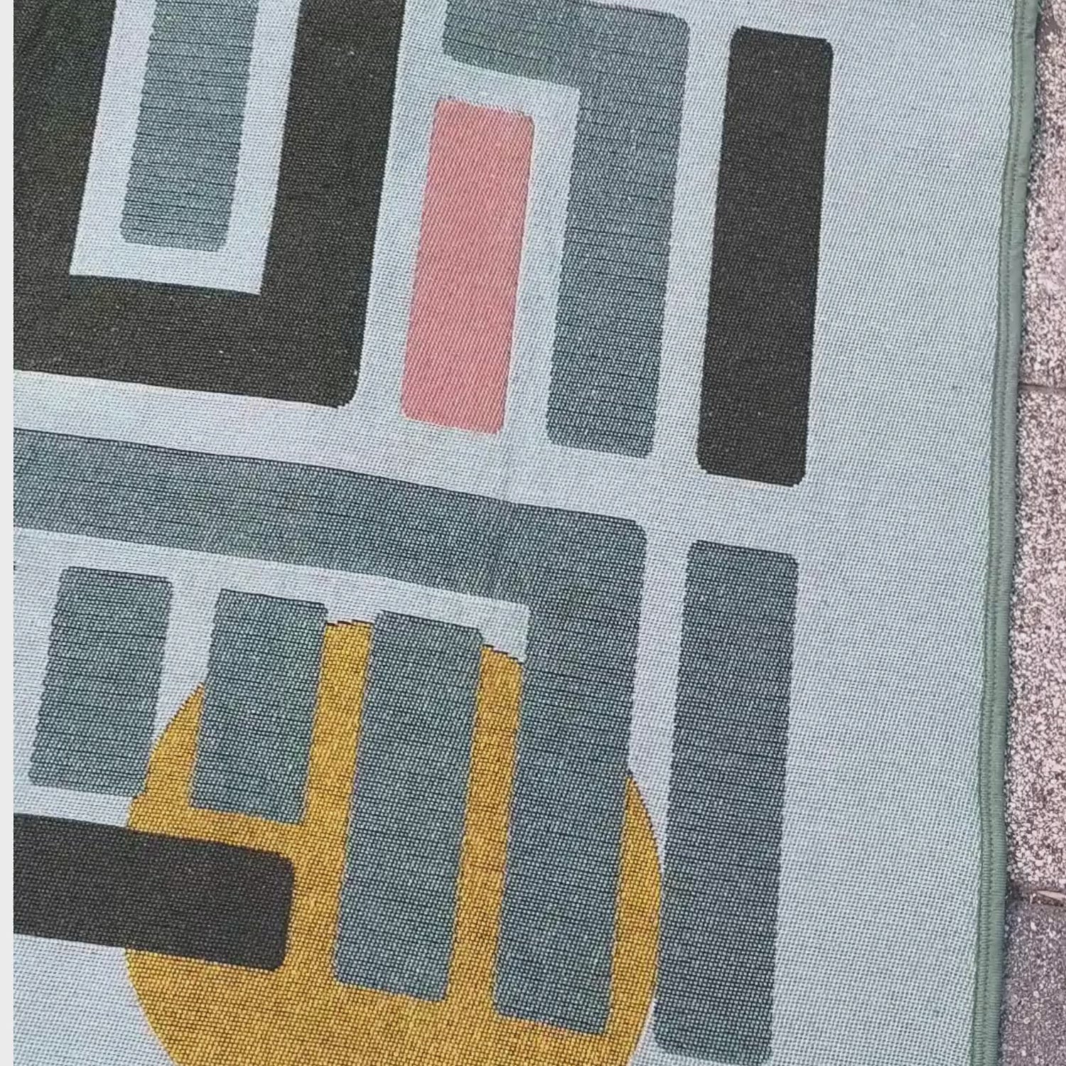 Bu kilim, tarafımızdan tasarlanmış ve geri dönüştürülmüş tekstil iplikleri ile yapılmıştır.  Makine üretimi olması sebebiyle el dokuması kilimlere göre biraz daha sık dokunmuş olan bu kilimi iç veya dış mekanda çift taraflı olarak kullanabilir ve çamaşır makinenizde yıkayabilirsiniz.